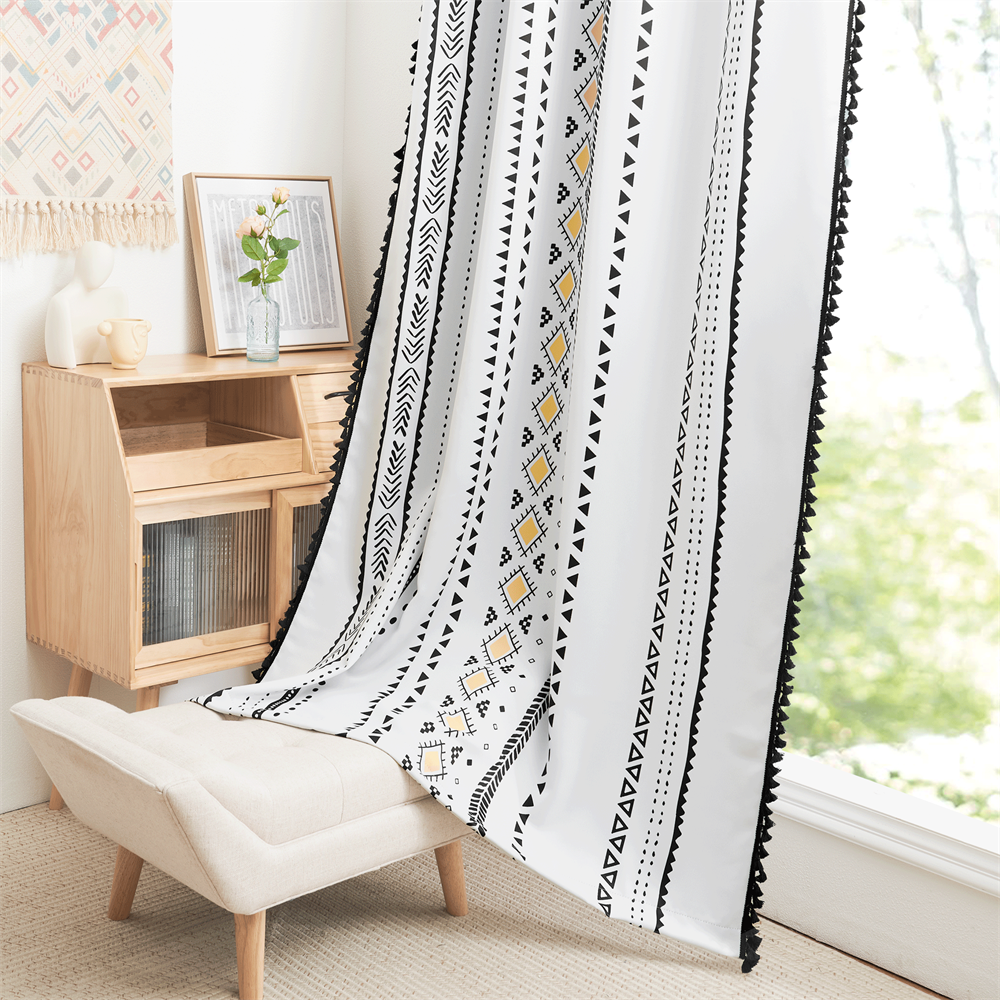 Kaipaatko kotiisi ripauksen persoonallisuutta ja matkojen inspiroimaa tunnelmaa? Boheemi etninen verho tupsureunuksella on täydellinen valinta sinulle, joka arvostat ainutlaatuista tyyliä ja viihtyisää ilmapiiriä. Kuvittele, kuinka nämä kauniit verhot muuttavat olohuoneesi, makuuhuoneesi tai minkä tahansa tilan kutsuvaksi ja eläväksi paikaksi. Valkoisen pohjan, rohkeiden mustien kuvioiden ja lämpimän keltaisen timanttikuvion yhdistelmä luo katseenvangitsijan, joka heijastaa rentoa ja vapaamielistä henkeä. Jokainen tupsu verhon reunassa lisää pehmeyttä ja luo hienostuneen, käsintehdyn tuntuman, tuoden huoneeseen syvyyttä ja tekstuuria. Anna valon suodattua kauniisti läpi ja luo kotiisi lämmin, kutsuva boheemi tunnelma.