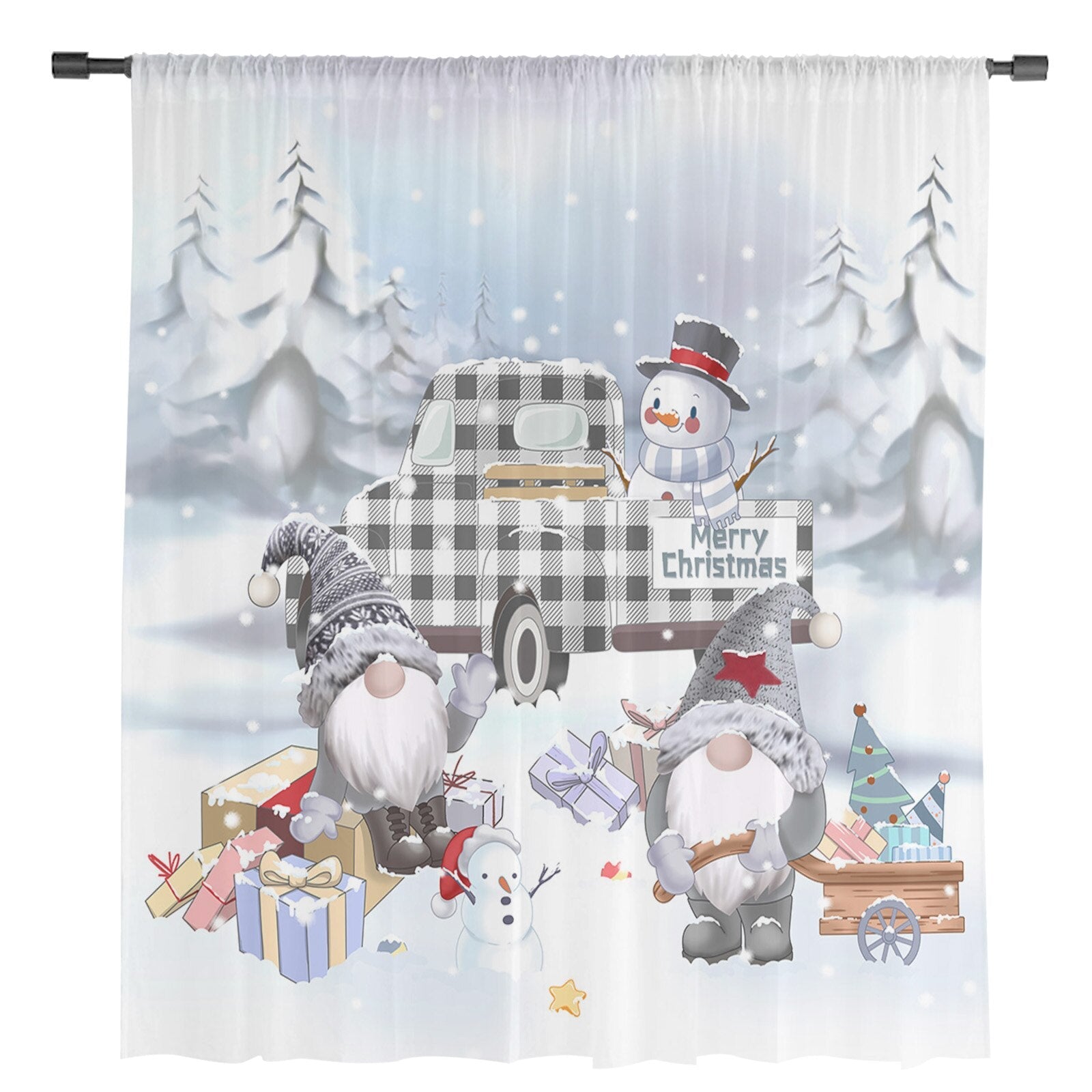 Tämä jouluaiheinen läpikuultava verho olohuoneeseen on täynnä ihastuttavia tarinoita ja hahmoja, jotka piristävät mieltäsi joka kerta, kun katsot sitä. Kaksi sympaattista tonttua, toinen valmiina ojentamaan lahjoja ja toinen istumassa pienen kärryn kyydissä joulukuusen ja lahjojen kera, tuovat esiin joulun anteliaisuuden ja ilon. Iloinen lumiukko hattunsa kera toivottaa 'Hyvää joulua' kyltillä, ja taustalla näkyvä vanha kuorma-auto ruudullisella kuviolla lisää ripauksen maalaistunnelmaa ja perinteisyyttä. Lumiset männyt ja lempeä lumisade täydentävät talvisen maiseman, luoden idyllisen ja rauhallisen näkymän suoraan ikkunaasi. Tämä verho on enemmän kuin sisustus – se on tarina, joka odottaa kertomista.