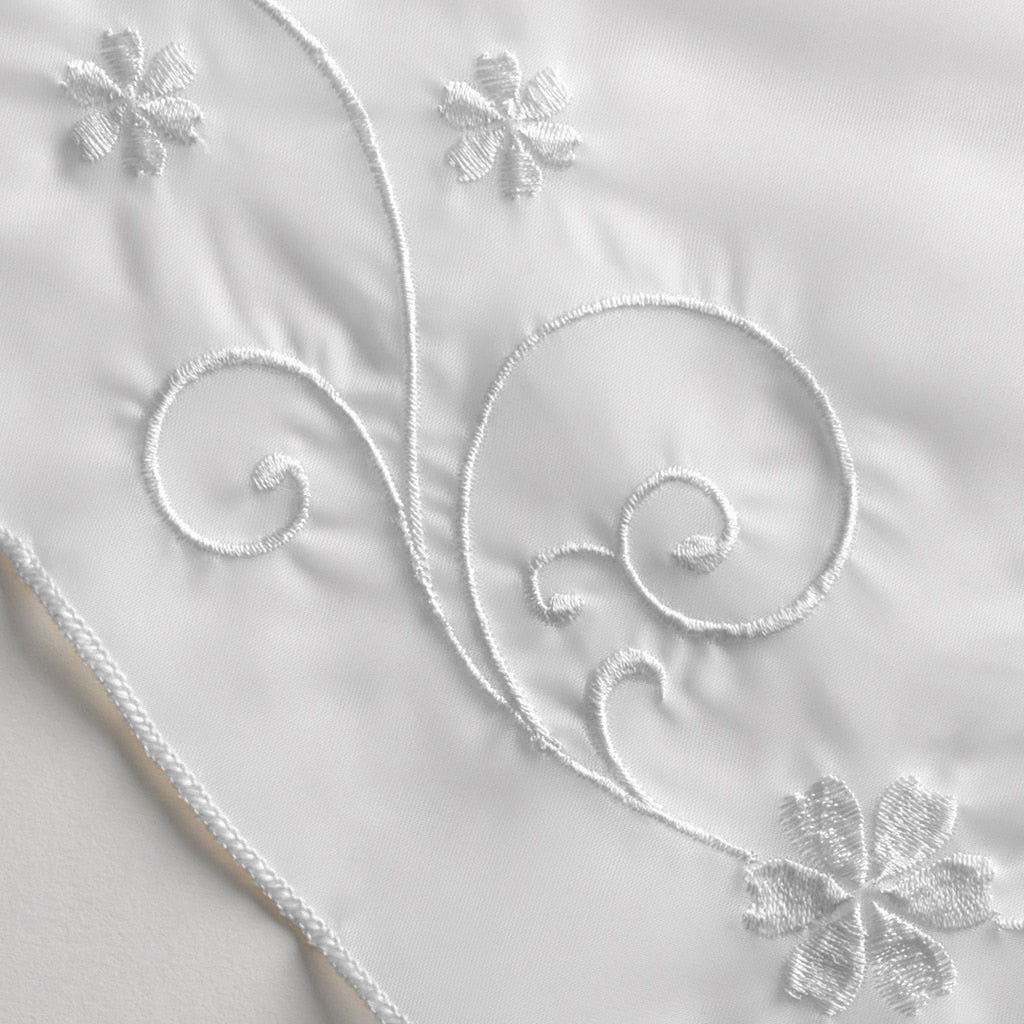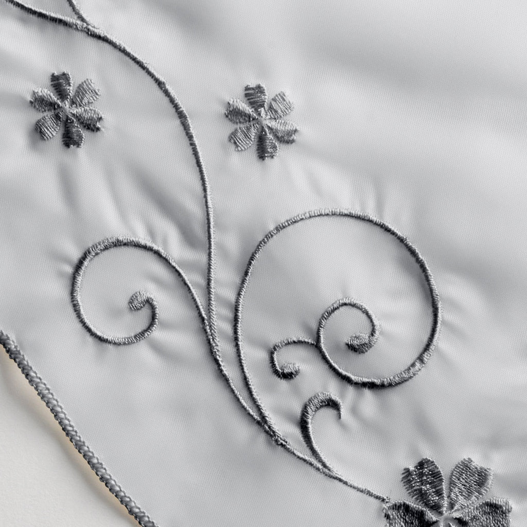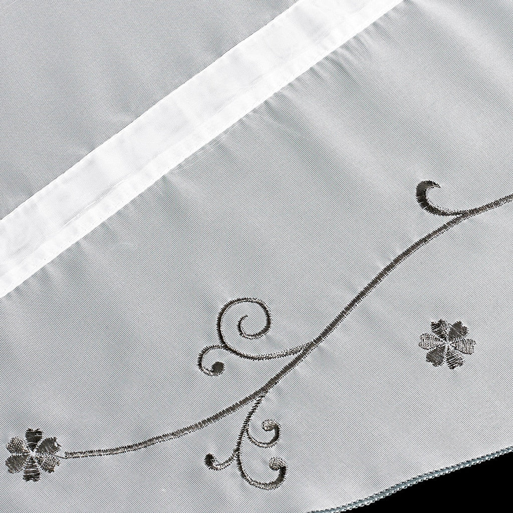 - **Tyylikäs kirjailu:** Hienostunut kukkakuviointi lisää verhoon persoonallista charmia ja luo tyylikkään yksityiskohdan keittiöön.