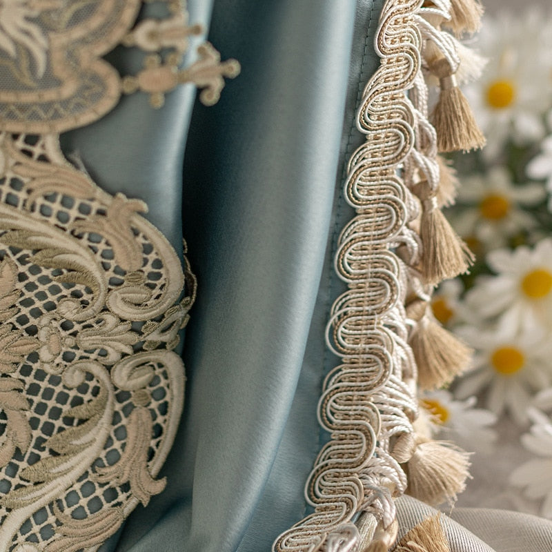 Jokainen yksityiskohta tässä pimennysverhossa on suunniteltu huolella luomaan harmoninen ja ylellinen kokonaisuus. Sisempi, paksu beigenvärinen kangas on korkealaatuinen pimennysmateriaali, joka pitää huoneesi viileänä ja pimeänä juuri silloin, kun sitä tarvitset. Ulompi, syvän turkoosin sävyinen verho on reunustettu näyttävällä pitsinauhalla ja herkullisilla tupsukoristeilla, jotka heiluvat kevyesti luoden eloisaa liikettä. Pitsissä toistuvat ornamenttimaiset kuviot ja beigen sekä harmaan sävyt täydentävät toisiaan täydellisesti, tuoden klassisen ja ajattoman ilmeen. Nämä koristeelliset elementit muuttavat yksinkertaisen verhon taideteokseksi, joka vetää katseita puoleensa ja kohottaa minkä tahansa huoneen ilmettä. Se on pitkäikäinen investointi kauneuteen ja toimivuuteen.