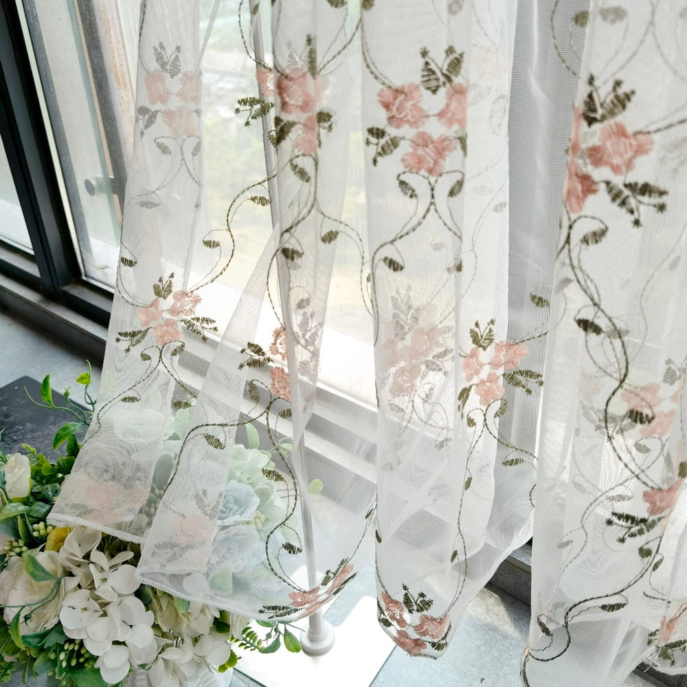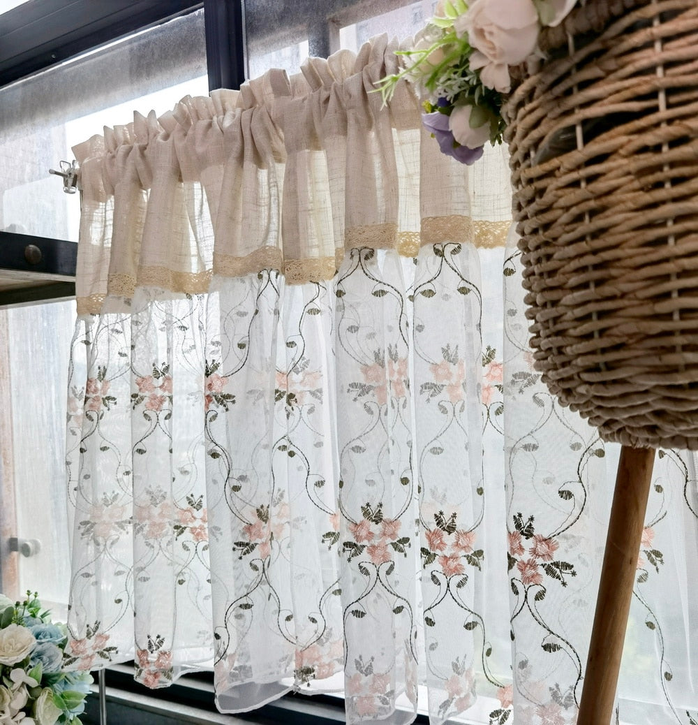 Tämä ihastuttava maalaisromanttinen kappaverho yhdistää vaalean, pellavankaltaisen yläosan ja ilmavan, läpikuultavan alaosan kauniilla pitsireunuksella. Yläosan neutraali sävy luo rauhallisen pohjan, kun taas alaosan herkät kukkakirjailut herättävät verhon eloon. Vaaleanpunaiset kukat ja vihreät lehdet kietoutuvat kauniiksi kuvioiksi, jotka antavat verholle sen ainutlaatuisen maalaisromanttisen ilmeen. Se on valmistettu kevyestä ja kestävästä materiaalista, joka päästää valon kauniisti läpi, mutta tarjoaa samalla miellyttävää yksityisyyttä. Verhon helppohoitoisuus ja ajaton muotoilu takaavat, että se ilahduttaa sinua vuodesta toiseen, tuoden jatkuvaa kauneutta ja viihtyisyyttä keittiöösi.