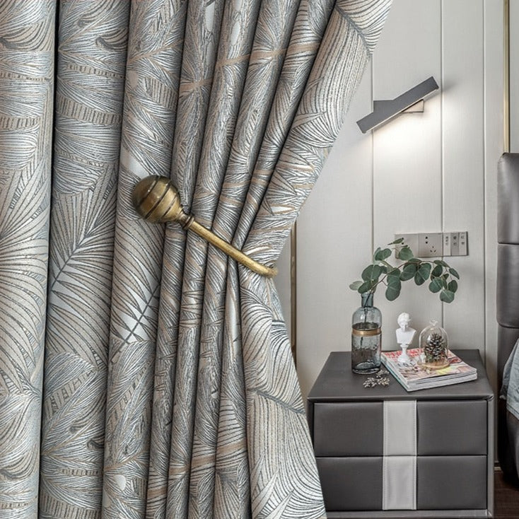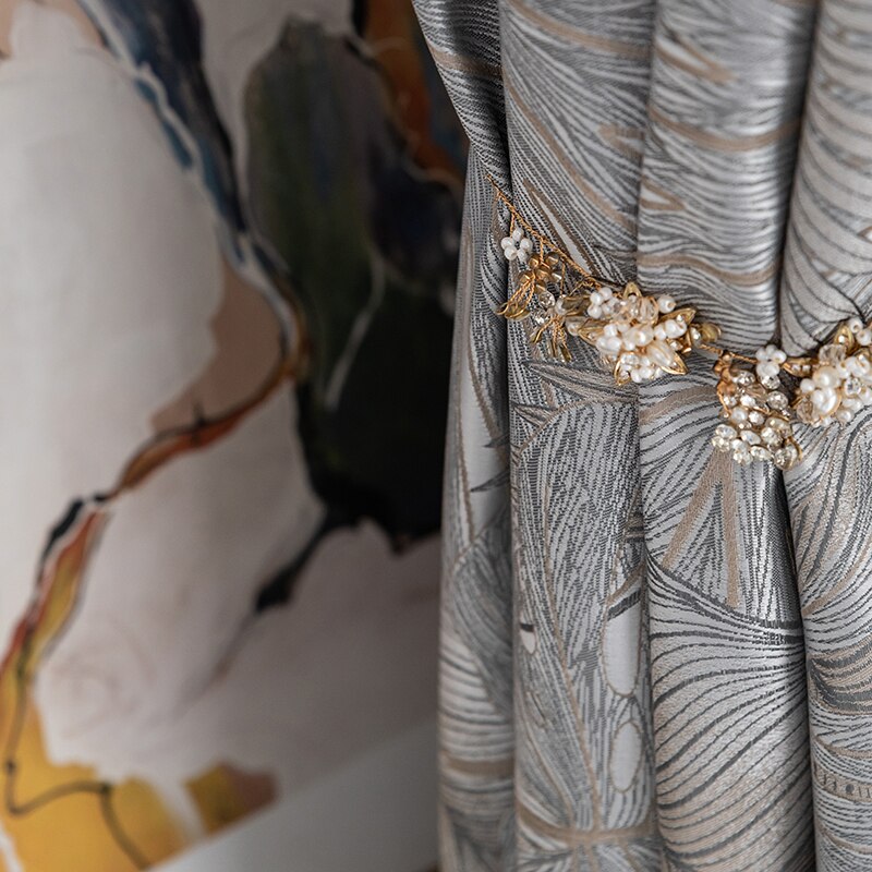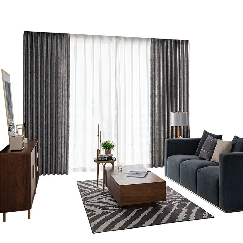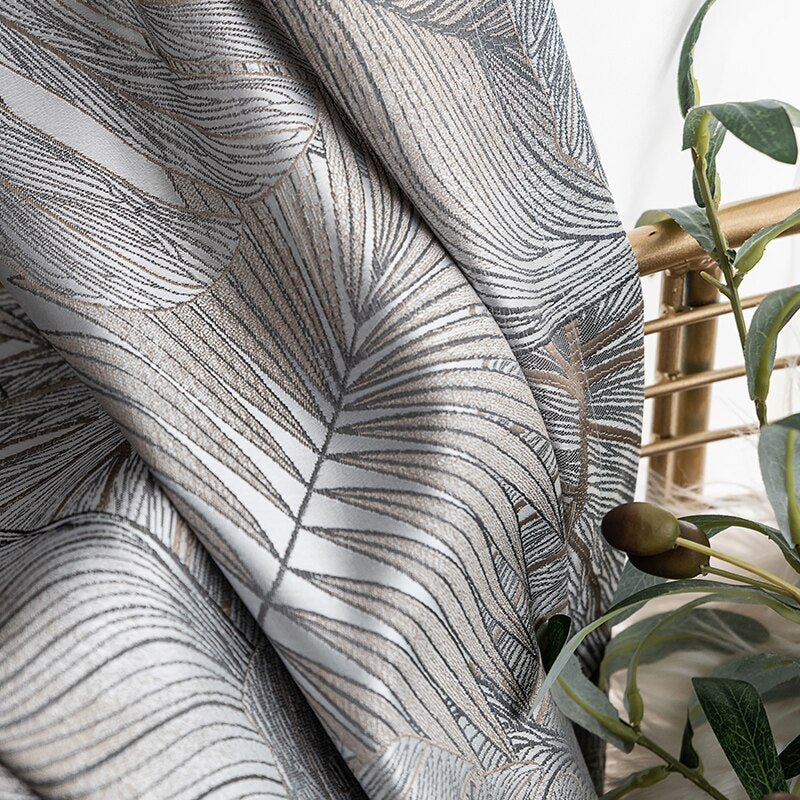 Tutustu tämän upean verhon yksityiskohtiin. Elegantti lehtikuvio, jossa on herkkiä viivoja ja hienostunut sekoitus harmaan ja hienovaraisten ruskean sävyjen kanssa, luo kiehtovan visuaalisen tekstuurin. Tämä kuvio ei ole vain painettu; se on kudottu luomaan syvyyttä ja ylellisen tuntuisen pinnan, joka tuntuu miellyttävältä ja näyttää upealta. Laadukas kangas takaa paitsi vaikuttavan estetiikan myös erinomaiset pimentämisominaisuudet, jotka ovat täydellisiä keskeytymättömään uneen tai elokuvailtaan ilman häikäisyä. Verhon tiheä kudos pitää huolen siitä, että ulkopuoliset valot pysyvät tehokkaasti poissa ja sisätilat pysyvät viileämpinä kesällä ja lämpimämpinä talvella.
