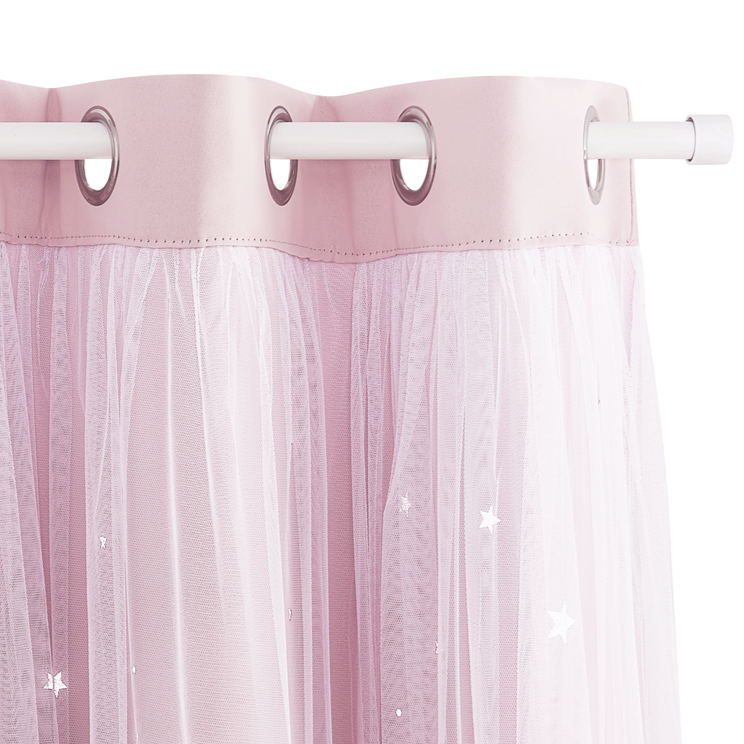 Muuta pienen prinsessasi huone taianomaiseksi turvapaikaksi tällä upealla vaaleanpunaisella kerrosverholla tytön huoneeseen. Tämä verho ei ole vain ikkunanpeite, vaan se on olennainen osa satumaisen ja kutsuvan ilmapiirin luomista. Kaksikerroksinen rakenne yhdistää kauniisti pehmeän vaaleanpunaisen pimennysverhon ja ilmavan valkoisen tyllin, luoden unenomaisen valon ja eleganssin leikin. Tuhannet pienet tähdet kimaltelevat molemmilla kerroksilla, herättäen eloon mielikuvituksen ja tuoden ripauksen tähtitaivaan magiaa suoraan huoneeseen. Täydellinen lisä jokaiseen tyttären huoneeseen, joka ansaitsee olla yhtä erityinen kuin hän itse.