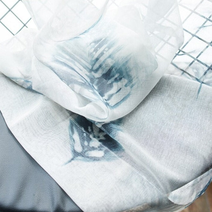 Valkoinen valkoverho sinisellä lehtikuviolla – luonnon inspiroimaa kauneutta