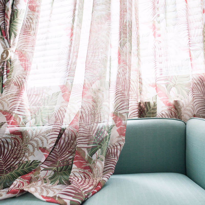 Tämän verhon ainutlaatuinen lehtikuviointi on saanut inspiraationsa luonnon monimuotoisuudesta ja trooppisten metsien runsaudesta. Voit ihailla monipuolisia palmunlehtiä ja muita eksoottisia kasveja, jotka on toteutettu kauniilla vihreän, korallinpunaisen ja ruskean sävyillä valkoisella pohjalla. Värit sulautuvat toisiinsa harmonisesti, luoden elävän ja silti rauhoittavan kokonaisuuden. Kun valo osuu verhoon, se korostaa kuvion yksityiskohtia ja luo huoneeseen pehmeän, lumoavan hehkun. Se muuttaa tavallisen ikkunan taideteokseksi, joka elää valon ja varjon leikissä läpi päivän. Tämä värikäs trooppinen valoverho lehtikuviolla kutsuu sinut viihtymään ja nauttimaan kodistasi täysin rinnoin, tarjoten jatkuvasti uusia visuaalisia elämyksiä.