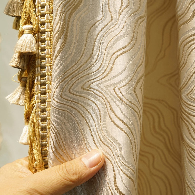 Tämä verho on suunniteltu huolella luomaan elegantti ja hienostunut tunnelma. Sen paksu, laadukas kangas upealla, aaltomaisella kuviolla luo syvyyttä ja tekstuuria, kun taas lämmin samppanjan tai kullan sävy heijastaa valoa kauniisti ja tuo tilaan ripauksen glamouria. Sen lisäksi, että verho on visuaalisesti vaikuttava, se tarjoaa erinomaisen pimennyskyvyn, varmistaen täydellisen pimeyden jopa valoisimpina aamuina. Kaksikerroksinen rakenne sisältää myös hienostuneen, brodeeratun läpikuultavan verhon, joka antaa mahdollisuuden säädellä valoa ja yksityisyyttä ilman, että tyylistä tarvitsee tinkiä. Kultaiset hapsut ja pitsikoristeet reunoissa sekä tyylikkäät, helmikoristeiset sidontanauhat viimeistelevät ylellisen ilmeen, tehden tästä verhosta makuuhuoneesi katseenvangitsijan.