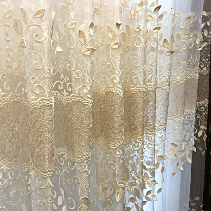 Tämä verho ei ole vain ikkunanpeite; se on sisustuselementti, joka kertoo tarinaa ylellisyydestä ja tarkkaan harkitusta tyylistä. Sen läpikuultava kangas antaa huoneen hengittää ja säilyttää ilmavan tunnelman, vaikka se onkin runsaasti koristeltu. Kultainen lehtikirjonta on taidokkaasti toteutettu, luoden kolmiulotteisen ja elävän vaikutelman, joka muuttuu valon mukaan. Auringonvalon osuessa siihen, lehdet ja kuviot ikään kuin heräävät eloon ja tuovat tilaan lempeän, kultaisen hehkun. Se sopii täydellisesti niin klassiseen kuin modernimpaankin sisustukseen, lisäten ripauksen glamouria ja persoonallisuutta. Valitse tämä verho, kun haluat luoda kotiisi kutsuvan ja esteettisesti miellyttävän ympäristön, jossa jokainen yksityiskohta on harkittu.